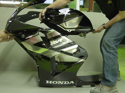 なかなか渋い感じに仕上がったRVFです。ウィングマークはクローム調塗装、最近は箔調塗装とも言うらしいです。この塗装は極端に塗膜が薄いのでシャープに見切れるのでイイカンジに仕上がりました。