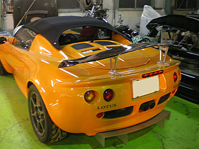 車もイッちゃってますが、もちろんオーナーもかなりのもんです。エリーゼは全塗装ではなく、リヤウィングの取り付けでした。ファイバーボディーにステーを付けるだけなので、純正でもステー周りが割れてきたりするそうです。そこで何とかならないかと相談を受けまして作ってみました。